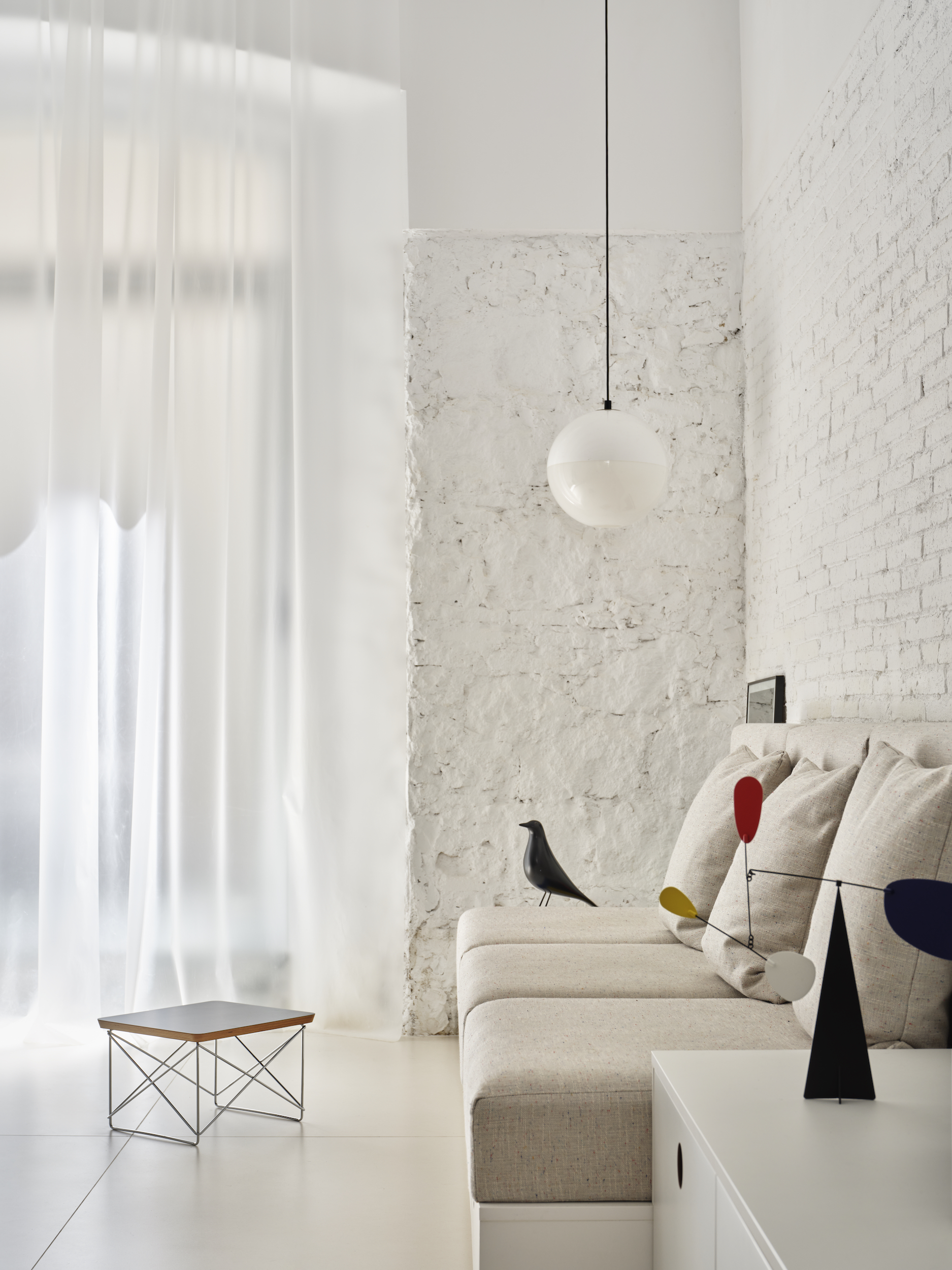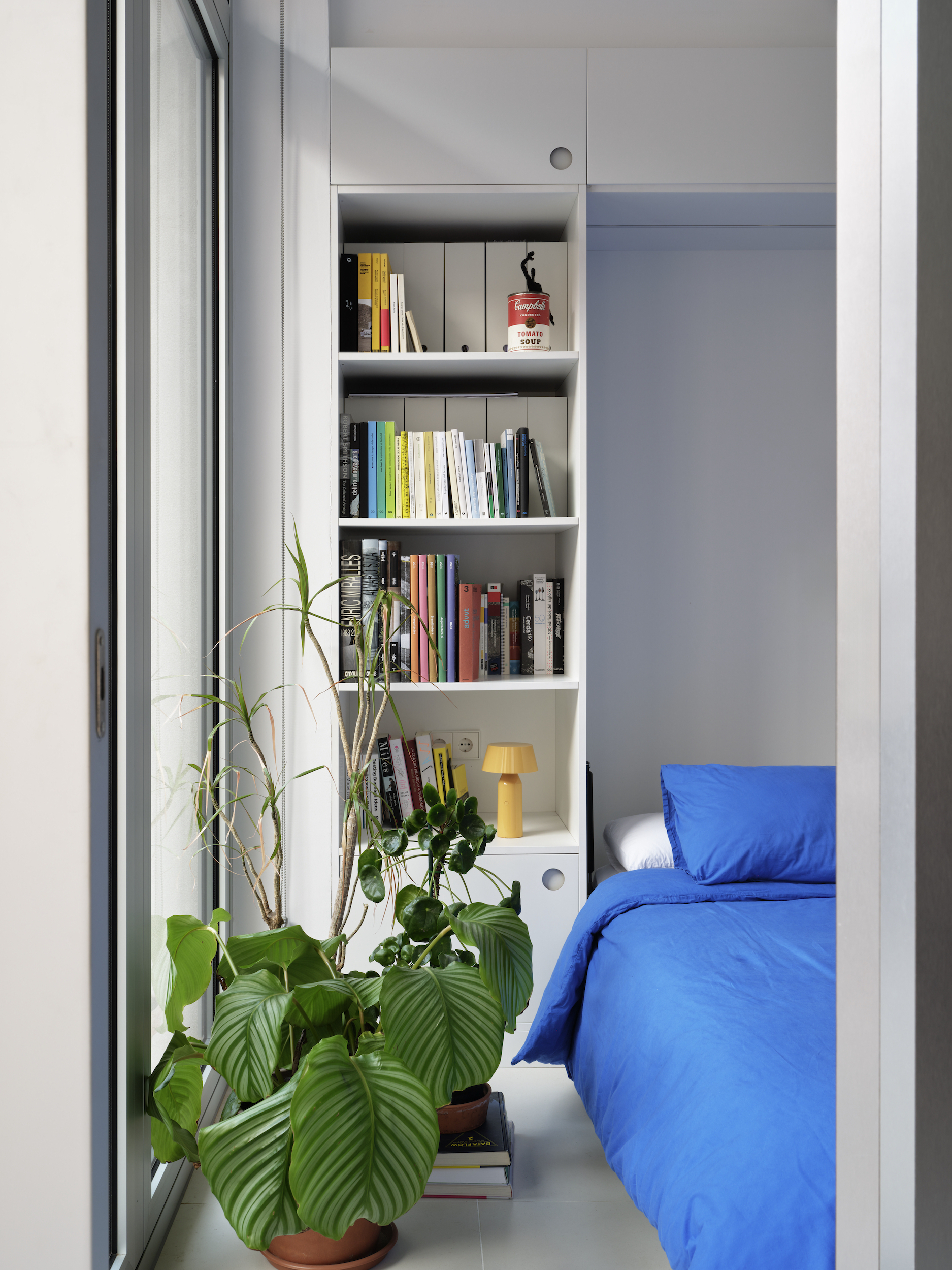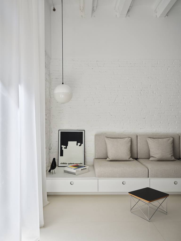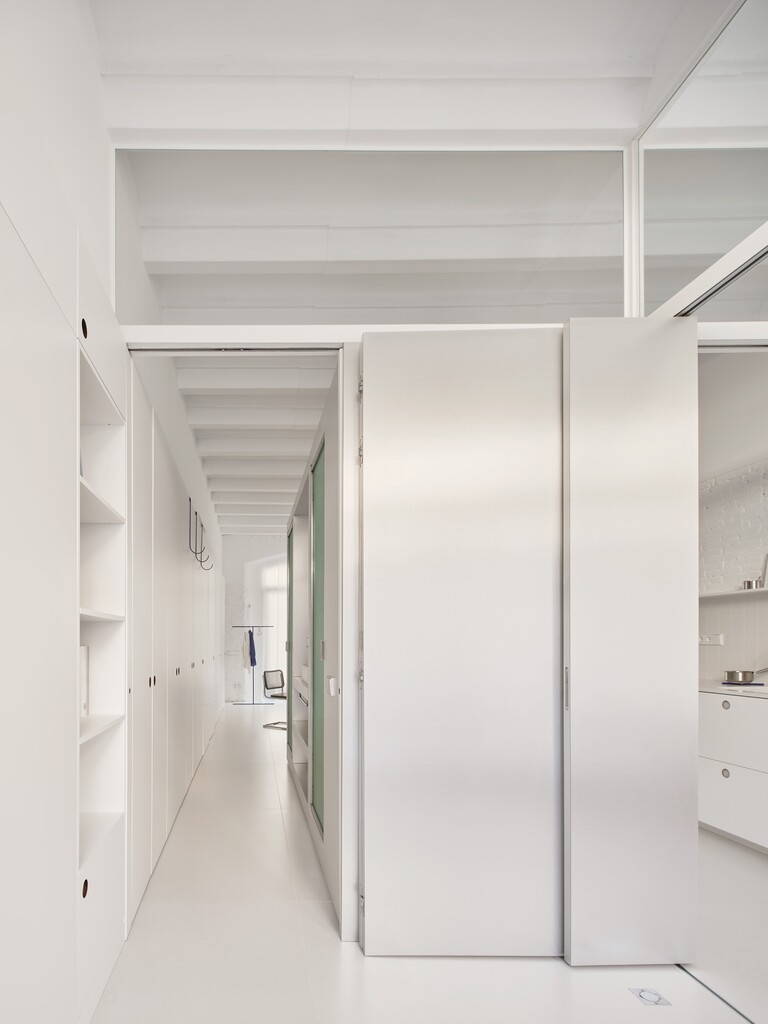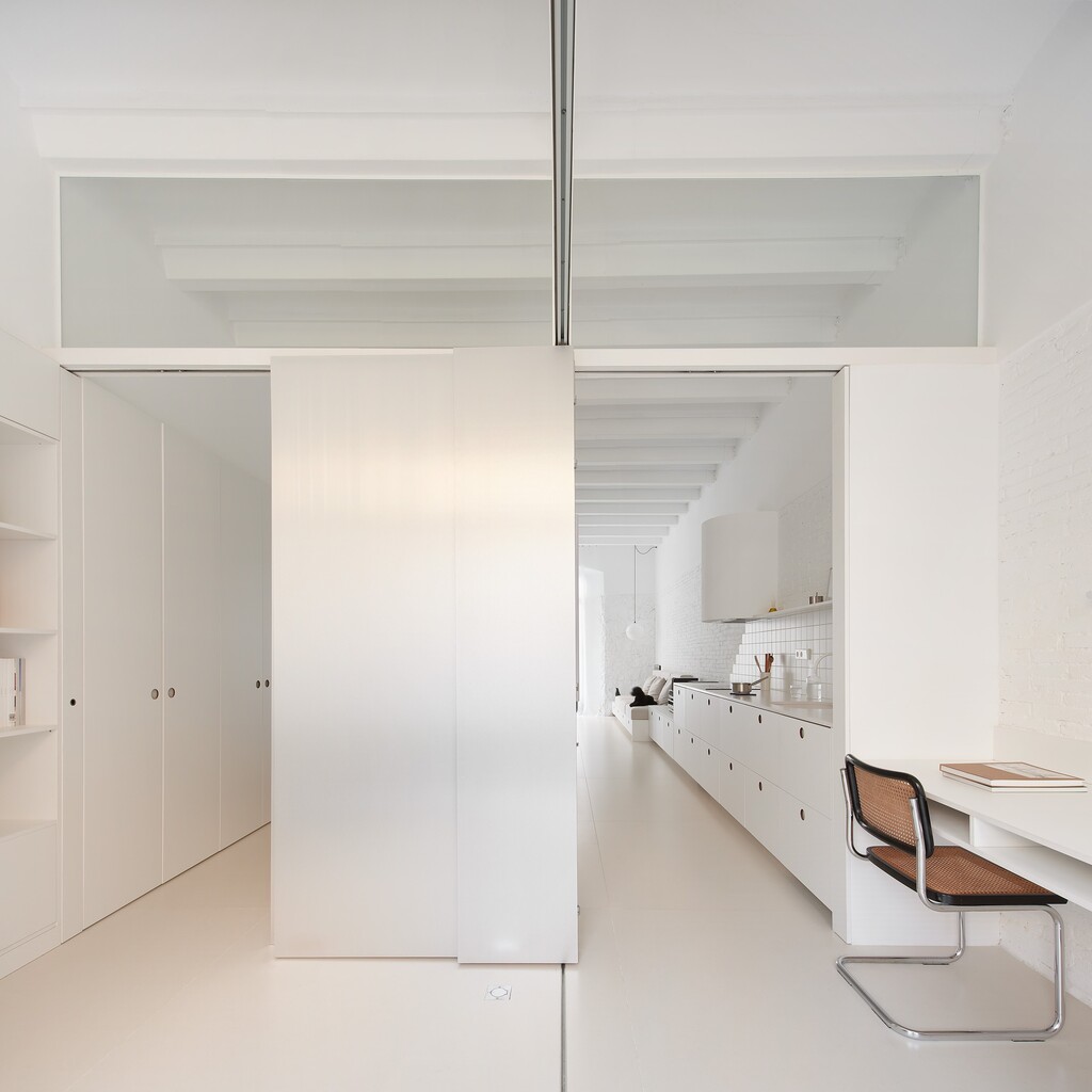 L’espai original, completament diàfan i sense memòria, es va despullar de revestiments per deixar visibles els materials estructurals i afavorir la transpiració dels murs. A partir d’aquí, s’apliquen dues estratègies: acumular programa i emmagatzematge al perímetre per alliberar la superfície central, i construir un volum exempt que actua com a filtre entre estances. Aquest volum conté bany, part de la cuina i panells mòbils que permeten reconfigurar l’espai segons les necessitats del dia.