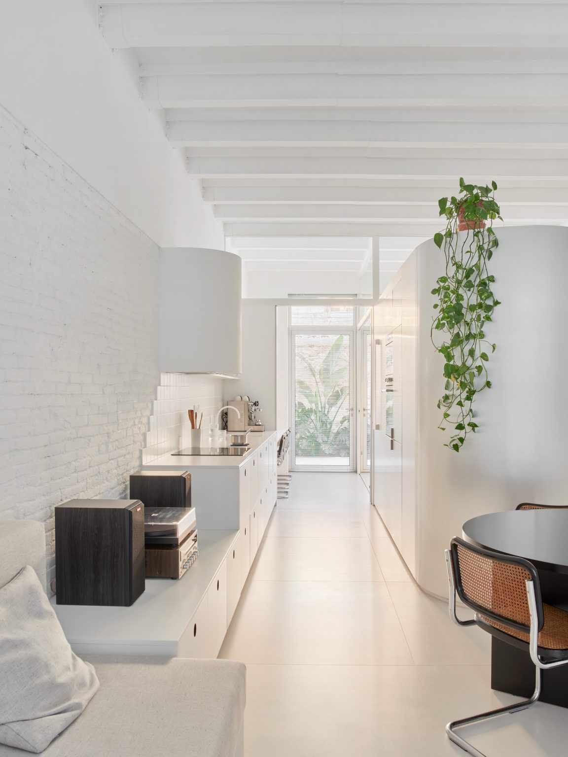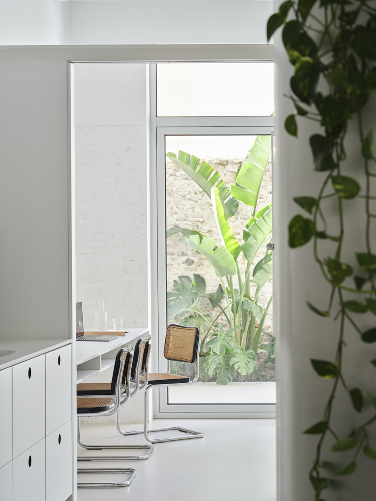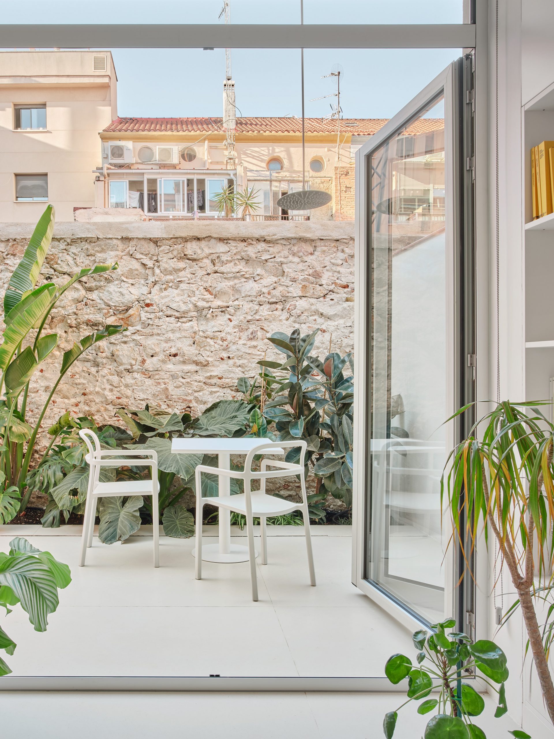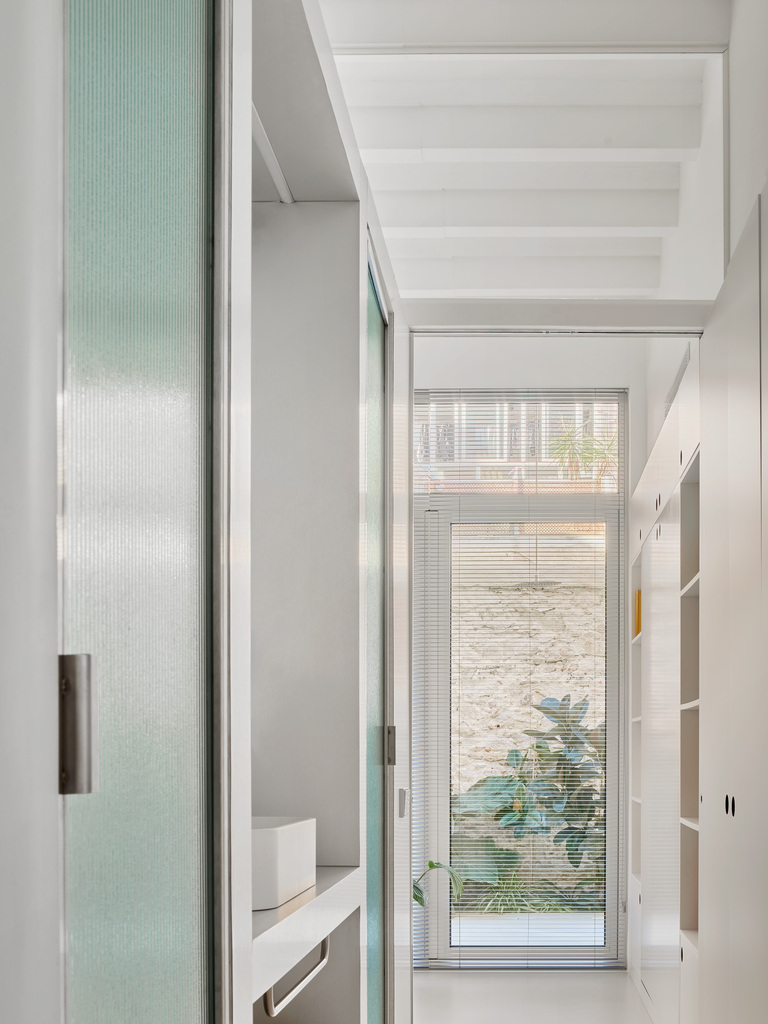 Aquesta disposició genera buits no programats, susceptibles d’acollir usos diversos. Finalment, l’obertura de la façana posterior connecta interior i exterior, mentre que els tons clars i l’alumini raspallat potencien la lluminositat d’un espai que, sense aquests recursos, resultaria fosc.