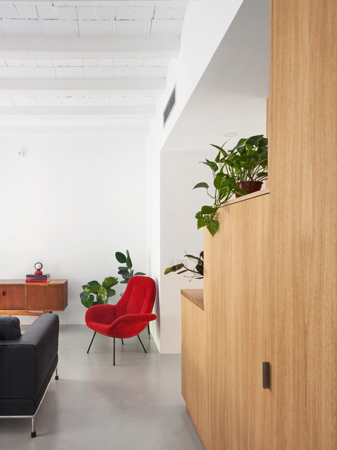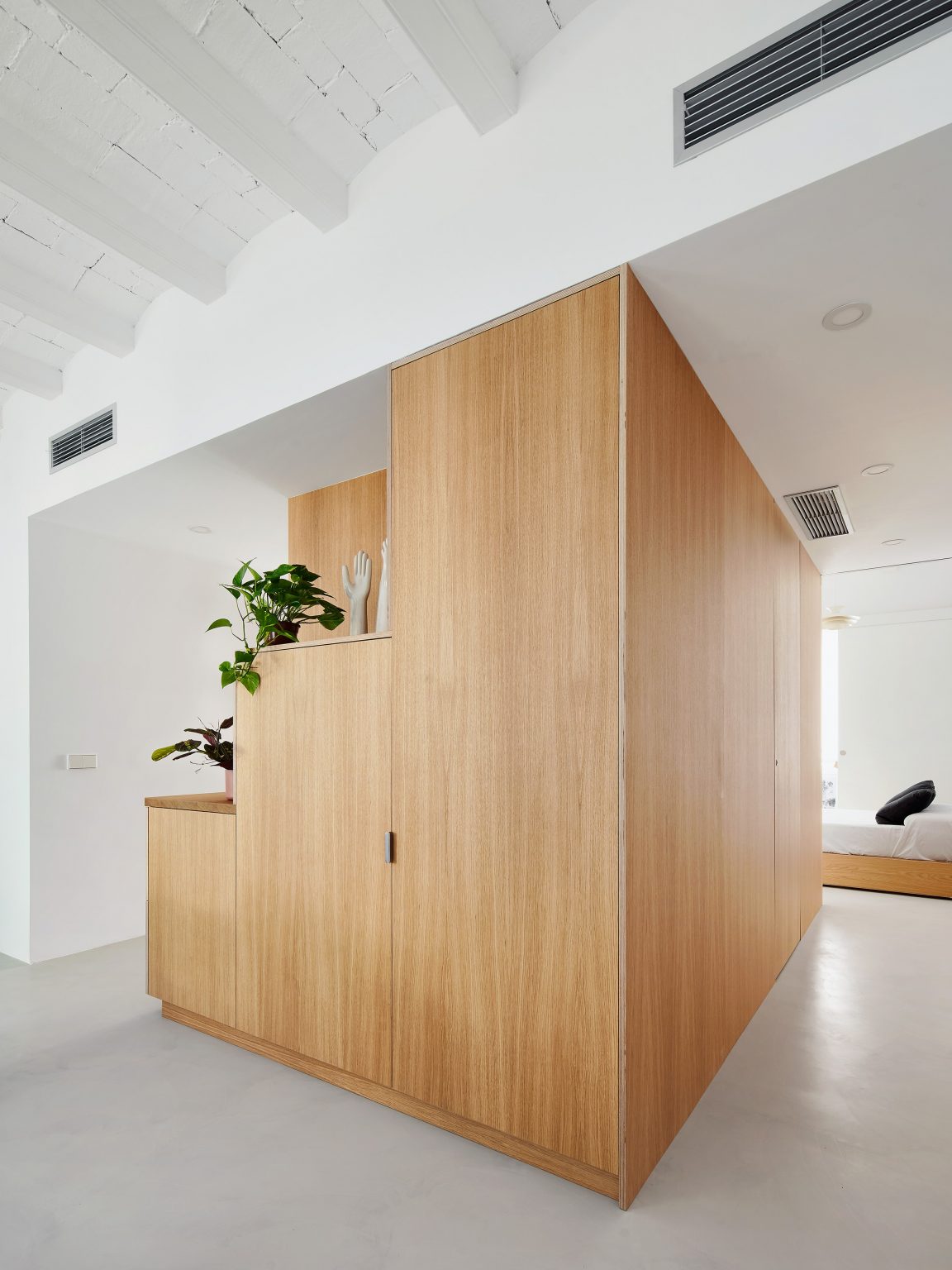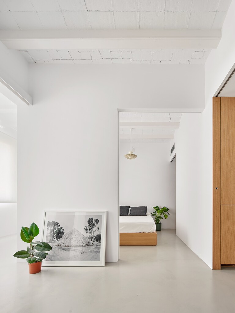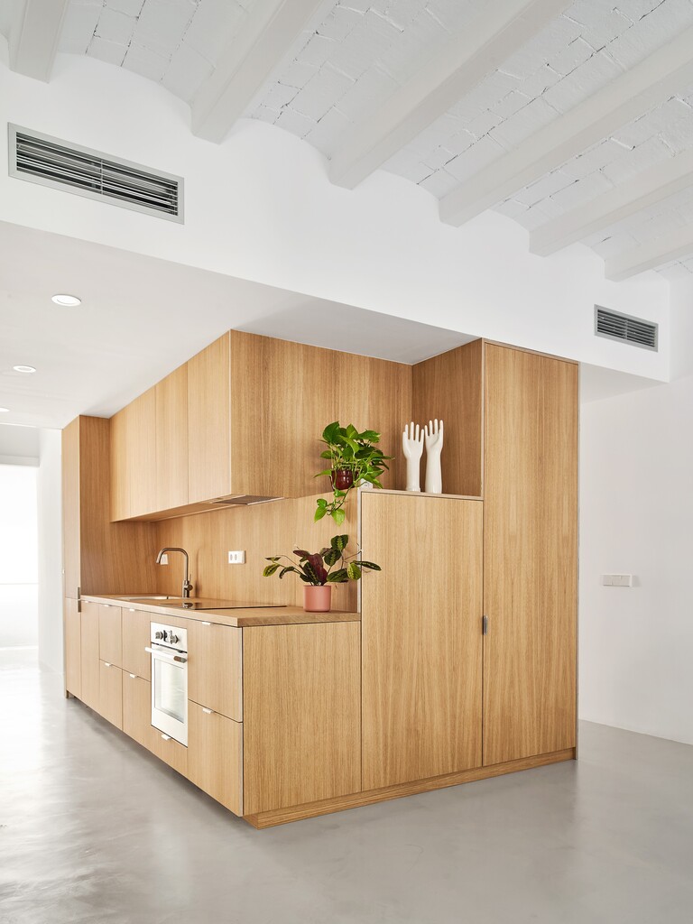 Després d’alliberar la planta de les particions existents, s’aixeca una caixa exempta que conté el programa humit i l’espai d’emmagatzematge de l’habitatge, i que funciona com a filtre entre la zona de dia i la zona de nit. Així, aquest volum permet una lectura contínua de l’espai interior alhora que té la capacitat de segregar-lo.