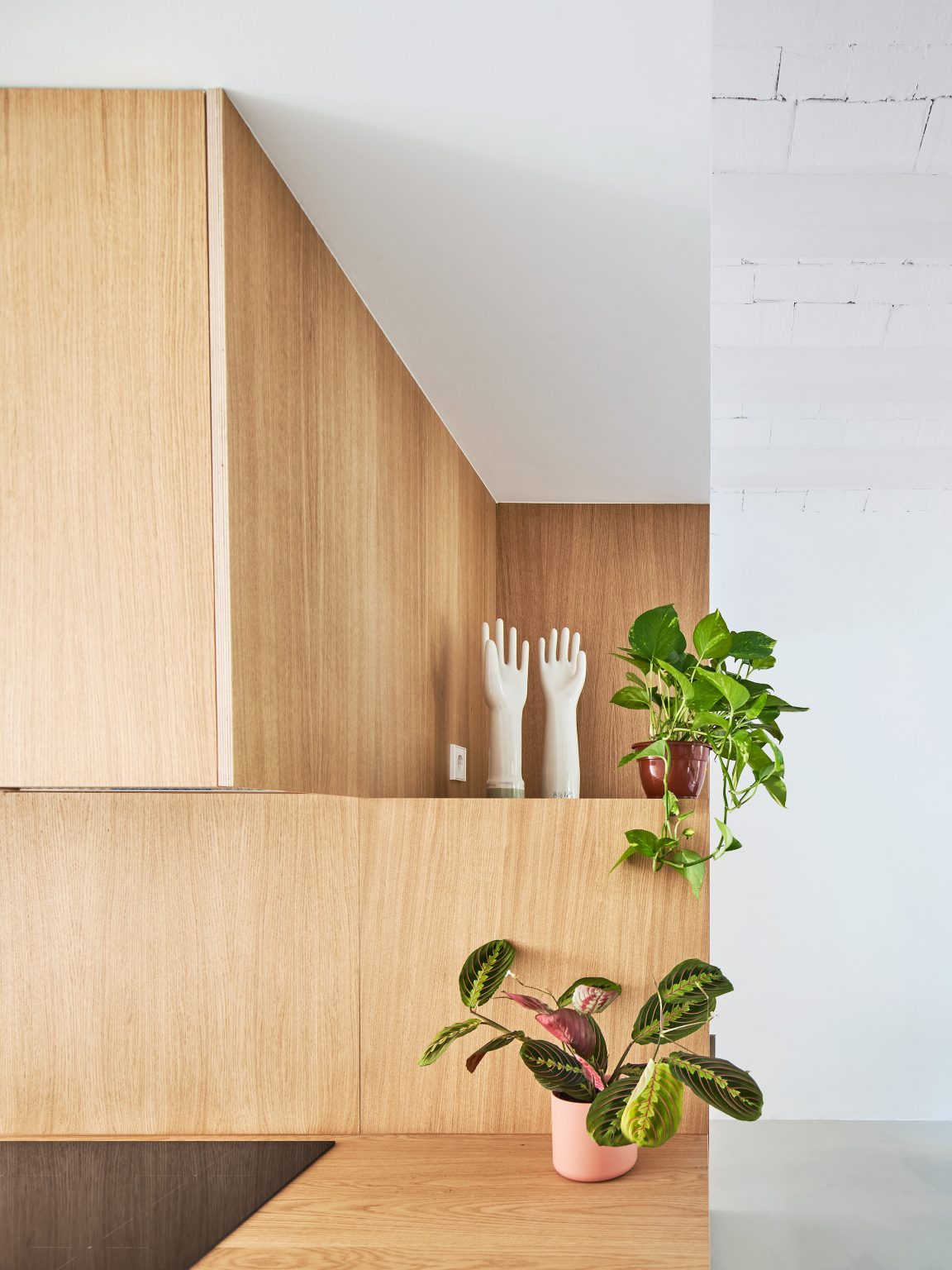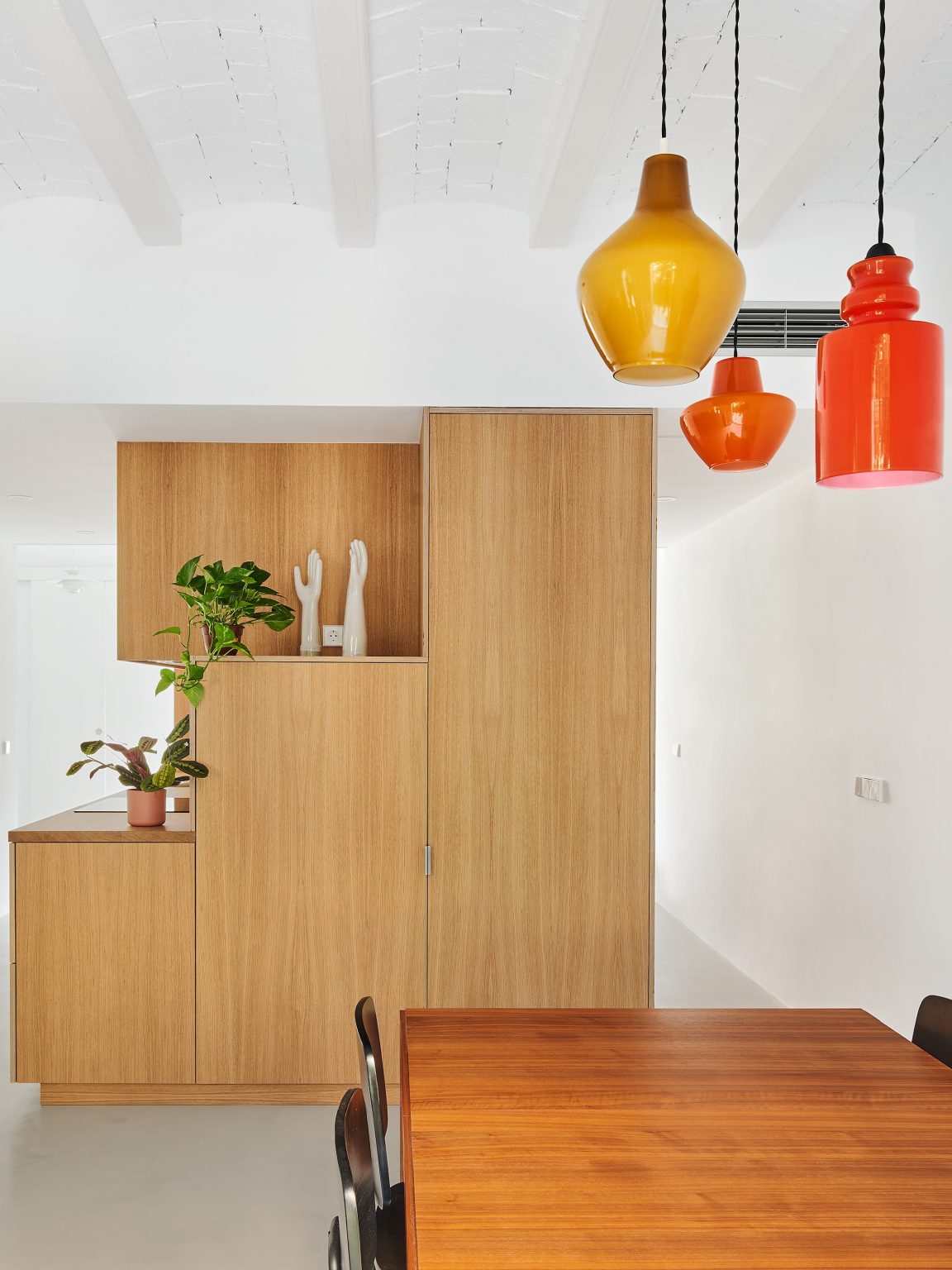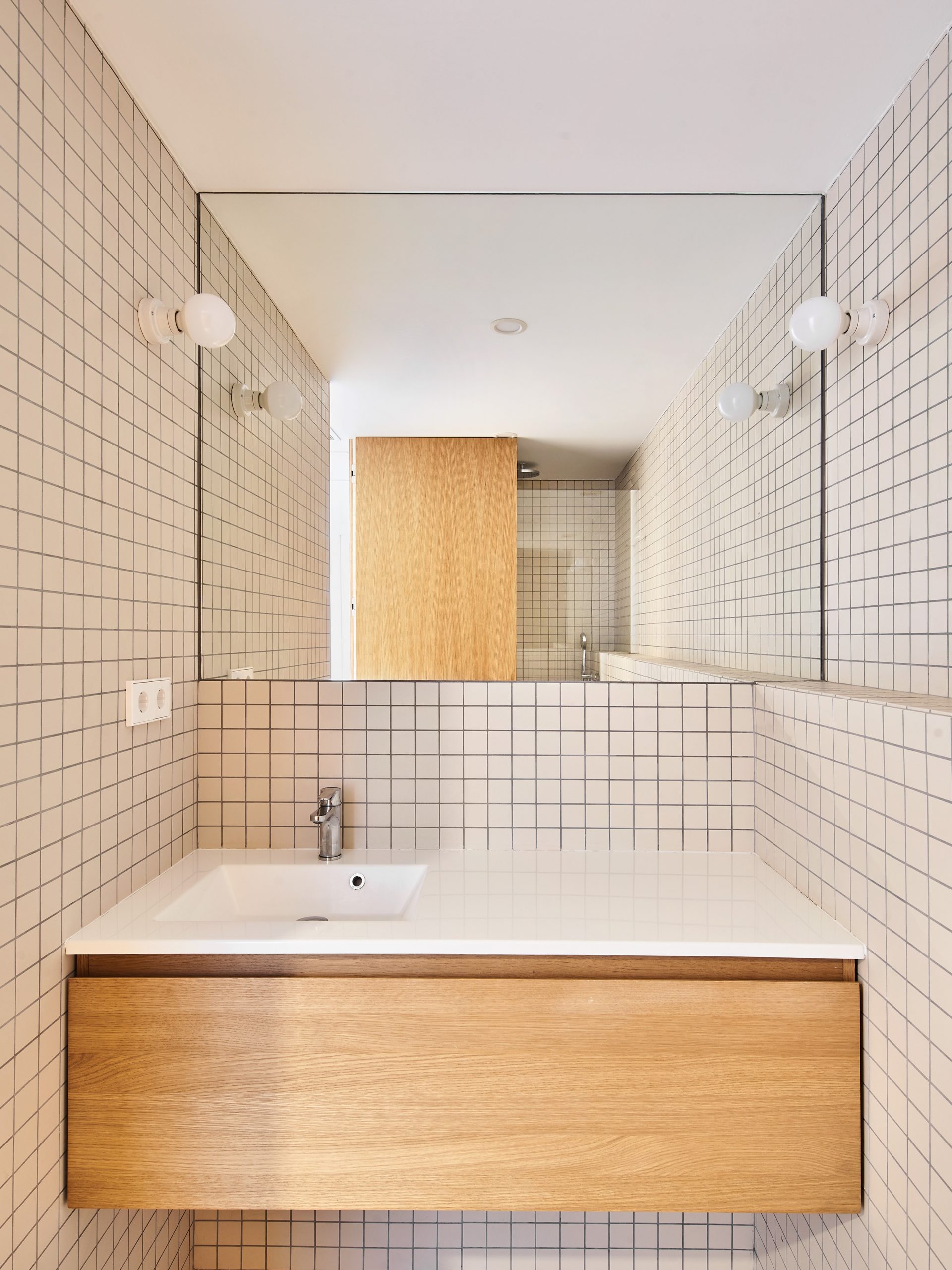 Després d’alliberar la planta de les particions existents, s’aixeca una caixa exempta que conté el programa humit i l’espai d’emmagatzematge de l’habitatge, i que funciona com a filtre entre la zona de dia i la zona de nit. Així, aquest volum permet una lectura contínua de l’espai interior alhora que té la capacitat de segregar-lo.