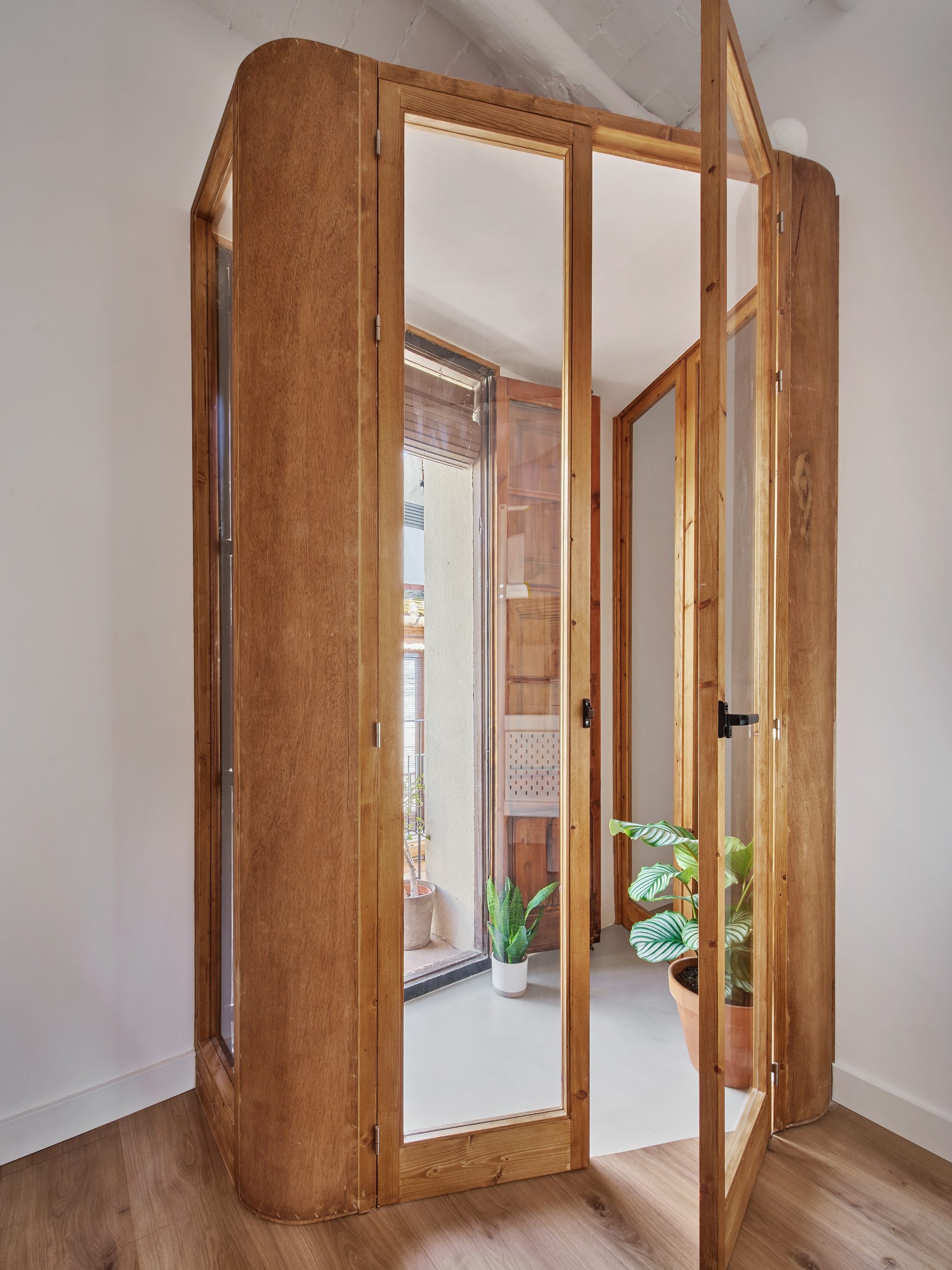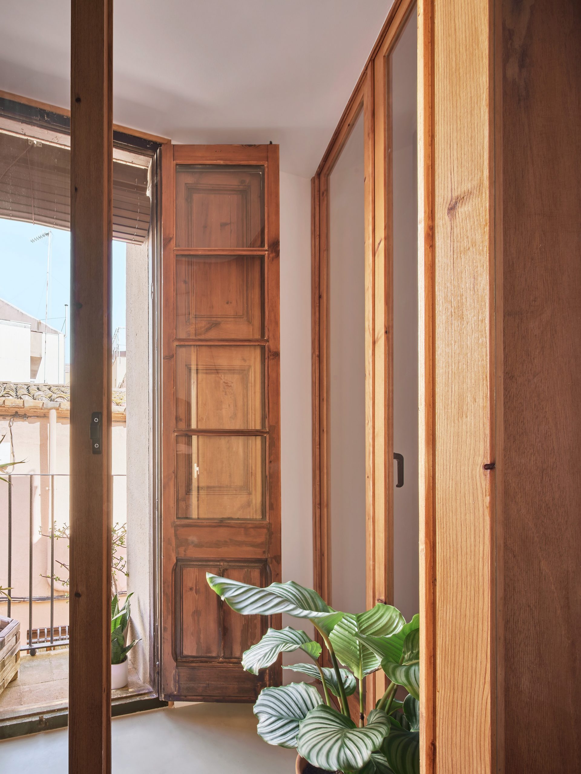 L’addició d’una galeria de fusta sobre el balcó existent resol aquesta condició i redefineix la relació amb l’exterior. Més que una ampliació, la galeria actua com una cambra intersticial que filtra la llum, ventila els espais i restableix una nova continuïtat entre interior i façana.